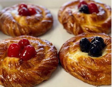 Our signature croissant dough cross laminated and baked into a round then filled with a granny smith apple ganache and topped with a apple slice and caramel.